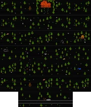 The forest in which almost all of the game is placed in is randomized each time the player traverses to a new screen. Special locations, identifiable by specific landmarks (which often contain notes) are never randomized. These locations will always look the same and be located in the same positions, despite their surrounding areas changing appearance upon each visit. Traversing to the edge of the environment will loop the player around to the opposite side. A map detailing the world of FAITH can be seen below.