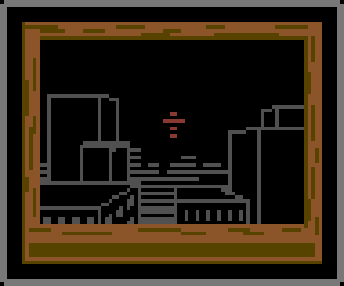 In one room, there's a lone window that has a floating red cross among buildings.