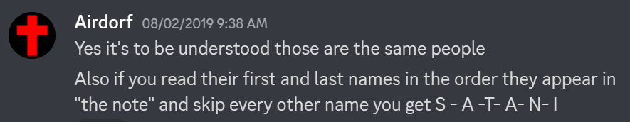 - The first letters of the first and last names of the three thralls in a specific order: Sandra-Angel-Troy, Attwood-Nogales-Ingles, spell out "SATANI", Latin for "SATAN". Airdorf confirmed the intentionality of this Easter Egg in the FAITH Fan Community Discord Server[2].
